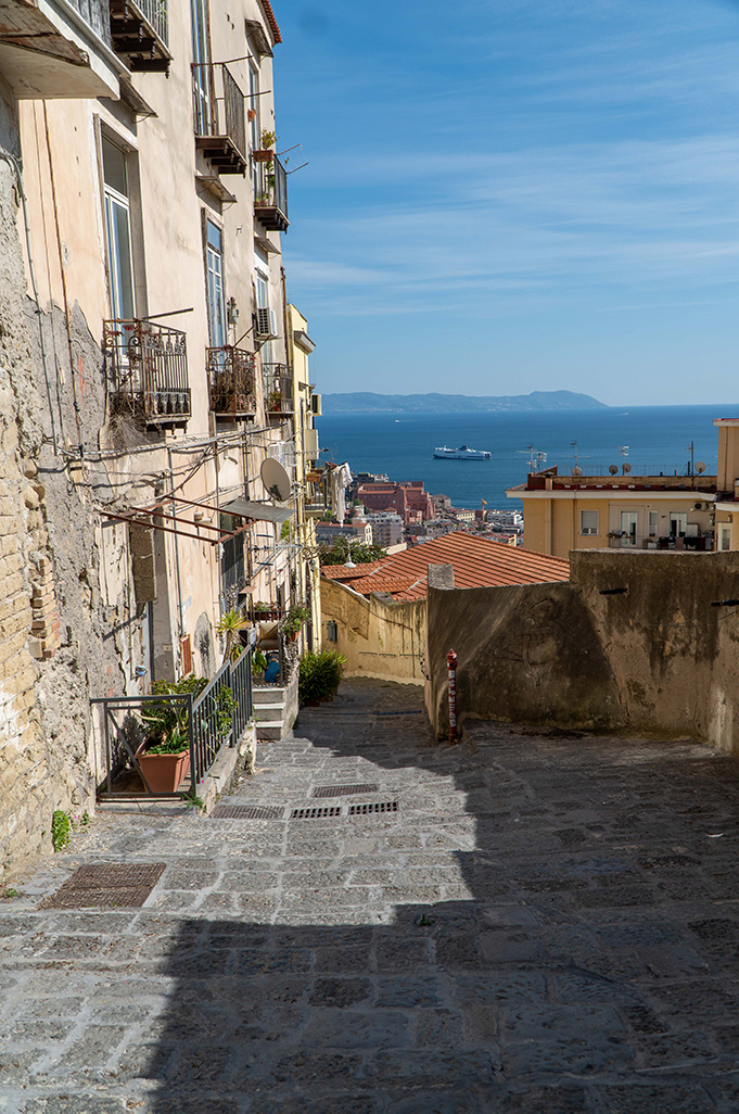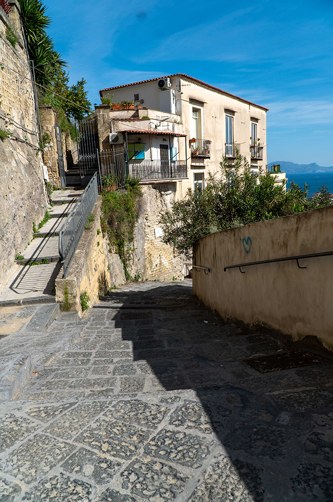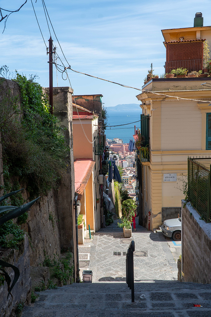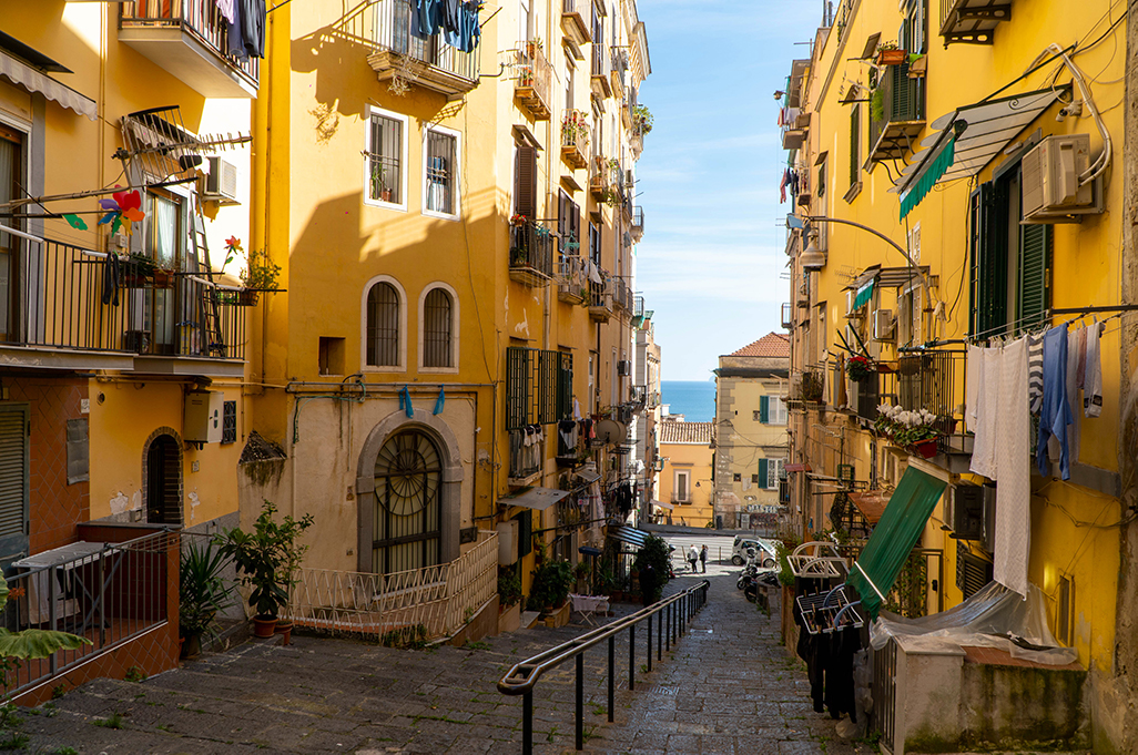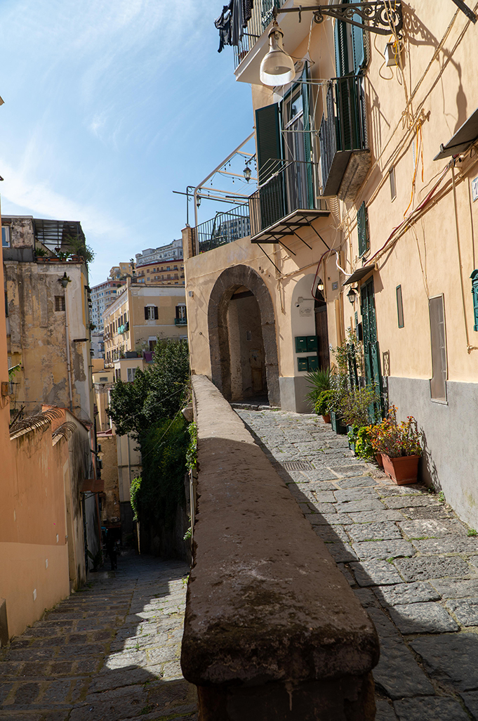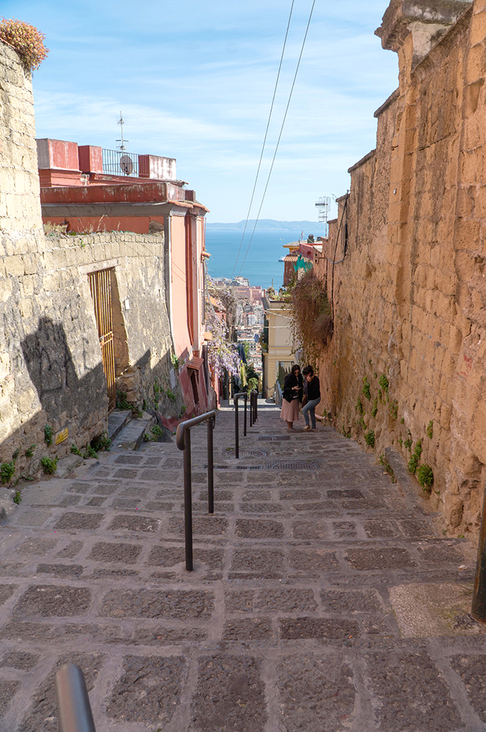 On the sides of the stairs you can immediately notice the yellow color of the Neapolitan tuff with which most of the houses were built, which seem to be built one on top of the other, and its architecture of houses and alleys that intertwine with each other is unique in its kind.