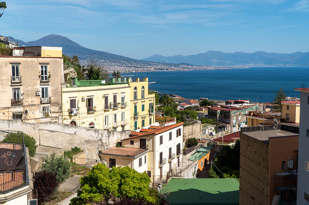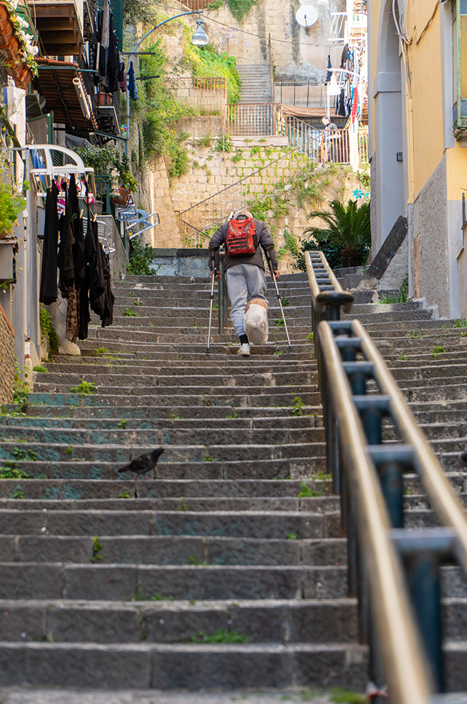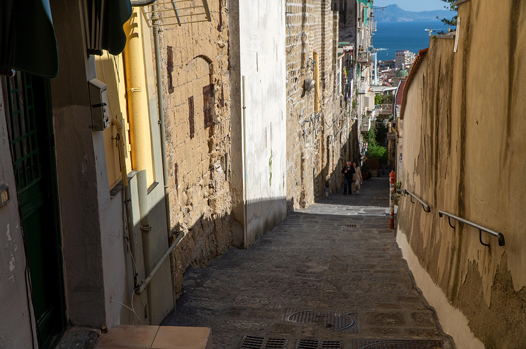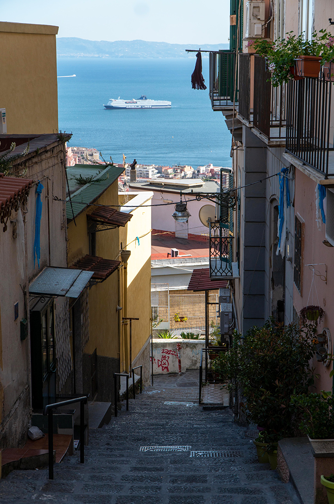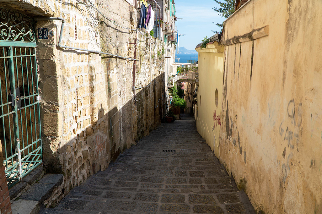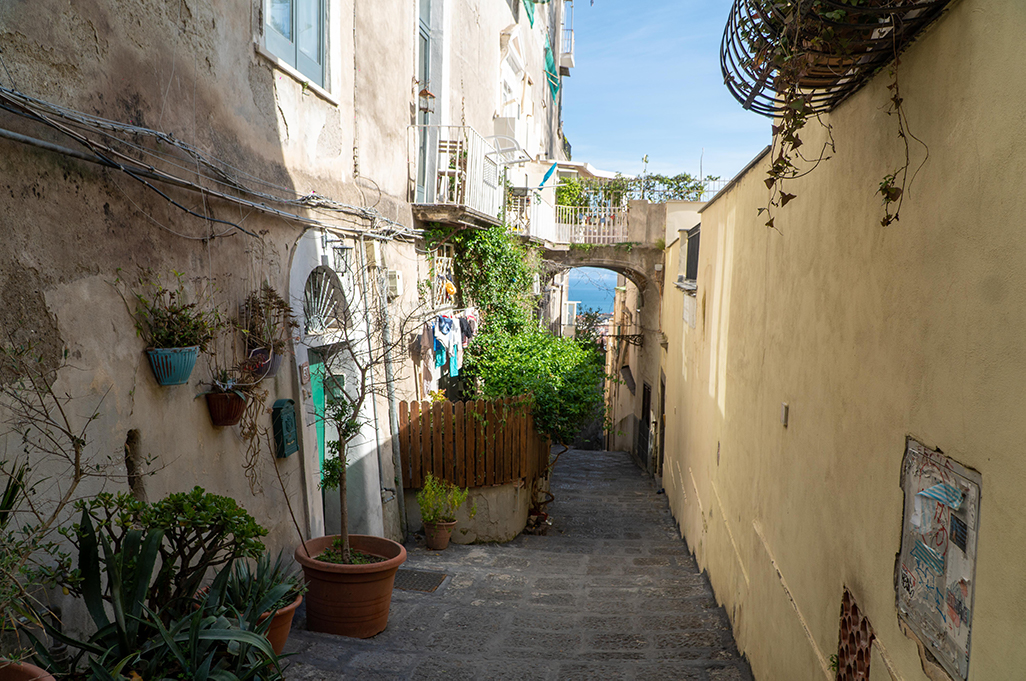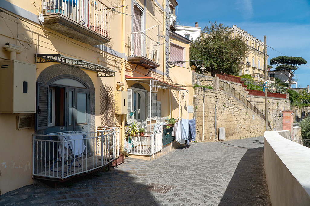 On the sides of the stairs you can immediately notice the yellow color of the Neapolitan tuff with which most of the houses were built, which seem to be built one on top of the other, and its architecture of houses and alleys that intertwine with each other is unique in its kind.